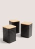 Store your kitchen essentials in these sleek and stylish canisters. Created with texture black metal for a sturdy construction, each piece is topped with a wooden lid for a nice contrast. The 'Tea', 'Coffee' and 'Sugar' labels, meanwhile, help with organisation.