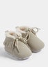 Get little feet all snuggled up with these uber comfy baby boots, fashioned with soft soles to ensure kindness on delicate skin. In a stone colour, they come with stylish fringe detailing, cute laces to the front and teddy fleece trims for toasty comfort. Tab detailing for easy on/off completes the pair.