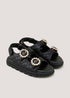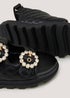 Put comfort at the forefront with these chunky sandals. Styled with a black quilted outer, the summer sandals feature a plush quilted texture, together with dazzling diamante buckle detailing for added sparkle. Additional features include a padded insock for maximum comfort, together with a sturdy cleated sole and a secure riptape ankle strap. A must on her holiday checklist.