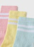 Add a pop of colour to their everyday essentials with this 3-pack of kids’ sport socks. Designed in pastel pink, yellow, and blue with sporty stripe detailing, these socks offer comfy cushioning and a snug ribbed fit, perfect for active days, school wear, or casual outfits.