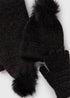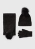 Material: Hat Scarf Body 65% Acrylic 30% Polyester 3% Elastane 2% Metallised Fibre Faux Fur Pompom 63% Acrylic 24% Polyester 13% Modacrylic. Gloves 48% Acrylic 45% Polyester 4% Metallised Fibre 3% Elastane.