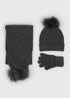 Beanie Scarf 76% Polyester 19% Acrylic 3% Metallised Fibre 2% Elastane. Faux Fur Pom 59% Acrylic 33% Modacrylic 8% Polyester. Glove 78% Polyester 17% Acrylic 4% Metallised Fibre 1% Elastane