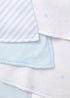 Learn moreWipe away baby's mealtime mess with this handy blue and white multipack. It includes 5 bandana-style bibs, all featuring a press stud fastening for easy on/off. Nice and comfy, they're lined with soft towelling and come complete in stripe, star and spot patterns, as well as plain variations.