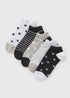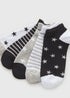 Our 5 Pack Girls Star Trainer Socks are a must-have for your little one's sock drawer. Made from a soft and durable cotton blend, these socks are gentle on your child's skin and will keep their feet cosy all day long. This pack includes trainer socks in versatile black, white and grey colour, detailed with fun stripe and star patterns. Perfect for everyday.