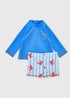 A must on your little one's holiday checklist, this adorable surf suit effortlessly combines style and function. Cut with long sleeves to keep them protected from the sun, the blue surf top features a high neckline and a back fastening for easy on/off. Blue and white striped swim shorts with an elasticated waistband are also included. A fun lobster print adds a playful finish, while the two-piece design makes nappy changing a doddle.