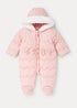 Learn moreKeep baby comfy and cosy in this plush snowsuit. Crafted with a pink padded outer, the design features a delicate foil star pattern and is trimmed with pretty bows to the front. Practical functions include double zip fastenings for easy on/off, together with a sumptuously soft fleece lining for added warmth and a faux fur trim hood. Perfect for chilly winter days.