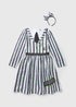 Spooktacular style awaits with our Beetlejuice kids black fancy dress costume! Perfect for your little ghoul, this dress will have them ready for any eerie adventure. With a headband and Beetlejuice dress, this 2 piece will ensure your little one is ready for a spooky Halloween.