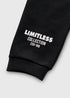 The Boys Black Limitless Co Ord Joggers feature a drawstring waist for adjustable fitting and soft, stretchable fabric suitable for both active wear and casual occasions. The right leg displays white text branding that reads: “LIMITLESS COLLECTION 230-198. Your little one will be effortlessly stylish and supremely comfortable in these joggers. Pair them with the matching Limitless Jumper for a complete look.