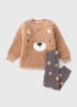 Our adorable brown bear top and leggings pyjama set is a must-have for your little one's nightwear collection. Crafted from a sumptuously soft fabric, these pyjamas offer unparalleled comfort for a restful night's sleep. These pyjamas feature a borg fluffy long sleeve top with an embroidered bear face design on the front with the matching brown leggings with light brown bears printed all over. The ribbed cuffs and elasticated waist in this set creates the perfect fit for your little one to have a perfect night sleep.