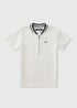 This is a cream-colored, short-sleeved polo shirt designed for boys aged 7 to 13. It features a black and white striped collar, a small zipper closure at the neckline, and an embroidered signature detail on the left side of the chest. With its sporty yet smart design, this baseball polo shirt is perfect for casual outings or semi-formal occasions. Pair this polo with shorts or chinos for a casual day or layer it under a sweater or jacket for cooler weather.