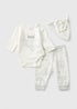 Learn moreThis adorable 3-piece set is perfect for your little one's next adventure. The set includes a long-sleeved bodysuit, trousers, and a hat, all adorned with the beloved Disney character, Dumbo. Crafted from soft and gentle fabric, this set ensures ultimate comfort for your child as they explore their surroundings.