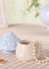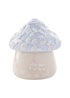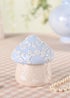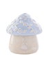 Add a touch of Wonderland charm to your home with this delightful mushroom ornament. Featuring a cream base illustrated with Alice among flowers and topped with a pastel blue cap decorated with embossed roses, it brings a whimsical yet elegant feel to any room.