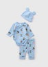 Dress your little one in classic Disney Baby Blue Mickey Mouse 3 Piece Bodysuit Set. This charming set includes a long-sleeved bodysuit, a pair of coordinating leggings, and a fun Mickey Mouse-shaped hat. All pieces are crafted from soft and durable cotton for all-day comfort. The bodysuit features popper fastening for easy changing and comfortable ribbed material.