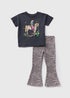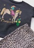 Learn moreCalling all little cowgirls! Our black cowgirl top and flare set is the perfect outfit for your little one to channel their inner cowgirl. This adorable set includes a black top with a horse graphic print and matching leopard print flare trousers. The top is made from 100% cotton for all-day comfort, while the elasticated waistband ensures the perfect fit for all day comfort. Tuck the top into a skirt or shorts for a more casual outfit or layer the top and flares under a jacket or cardigan for added warmth.