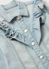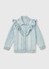 This denim jacket features popper buttons for easy closure and a touch of convenience. The frill detailing on the front and back adds a playful and trendy element to the design. Crafted for both comfort and style, this blue denim jacket is perfect for layering over her outfits for a cool and casual look.
