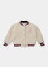 Achieve a delightful blend of comfort and style for your youngster with this charming soft bomber jacket. Made from cream borg fabric, it offers cosiness for cooler days. The black and pink stripes on the collar, snug cuffs, and stretchy hem add a touch of prettiness. The varsity-style 'A' provides a cute youthful touch, while the button fastenings and functional pockets offer practicality. This jacket combines warmth, fashion, and utility seamlessly, making it an essential addition to your child's wardrobe for both comfort and style.