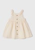 Learn moreThis cream dress features a lining and charming yellow vertical stripes, bringing a touch of sunshine to the outfit. Bow details on each shoulder add a sweet and playful touch. The dress is adorned with brown buttons up the front, not only adding a stylish element but also providing ease of dressing.
