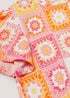 Learn morePerfect for summer dressing, this bold number will keep her cool and comfy, all the while looking super cute. Styled with a striking floral crochet patchwork print, the crinkle textured top combines a mix of orange, pink, yellow and white for a vibrant finish. Simple crew neck styling and flouncy frill sleeves complete the dazzling design.