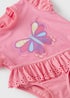 Splash into summer fun with our vibrant pink butterfly tankini. This stylish tankini is designed with playful puff sleeves and frill scalloped ruffle detailing on the bottoms, adding a touch of style to your little one's beach day. With a zip from the neck it is easy to get off after splashing in the water and can be styled with the butterfly poncho for a cool set look.