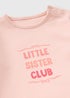 Celebrate your newest arrival with this adorable pink “Little Sister Club” sleepsuit. Designed with comfort in mind, it’s crafted from soft fabric that’s gentle on delicate skin, making it perfect for day cuddles and cosy nights. A sweet slogan design adds a cute finishing touch to her everyday essentials.