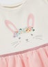 The top half of the dress is crafted from a comfortable and stretchy white ribbed fabric, ensuring a snug fit. Adorned on the front is a cute bunny face, complete with playful floral accents that add a touch of whimsy. The bottom half transitions into a soft, pink mesh material that's as comfortable as it is stylish, offering ample room for movement and play. Short sleeves make it ideal for warmer weather, ensuring your little one stays cool and comfy all day long.