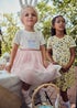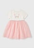 Learn moreThe top half of the dress is crafted from a comfortable and stretchy white ribbed fabric, ensuring a snug fit. Adorned on the front is a cute bunny face, complete with playful floral accents that add a touch of whimsy. The bottom half transitions into a soft, pink mesh material that's as comfortable as it is stylish, offering ample room for movement and play. Short sleeves make it ideal for warmer weather, ensuring your little one stays cool and comfy all day long.