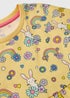 This short sleeve dress features an all-over print in cheerful yellow, showcasing a delightful scene with white bunnies amidst flowers and rainbows. Crafted for comfort and cuteness, this dress is perfect for playful days and special occasions. The vibrant and whimsical print adds a touch of happiness, making it a delightful choice for any little one. Let her hop into fun-filled adventures with confidence in this adorable and comfortable yellow bunny dress, perfect for adding a burst of joy to her everyday moments.