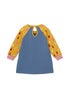 This dress features a whimsical mix of yellow raindrop prints on blue base, capturing the joy of puddle-jumping adventures.