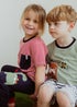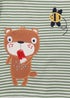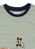 100% GOTS organic cotton. Sustainable & ecofriendly. Applique Sid and buzzy bee. Green stripe pattern. Lilly + Sid logo tab to the hem