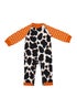 With its bold cow print body and contrasting pumpkin star sleeves, this unique design blends the beauty of the wild with a playful celestial touch. The relaxed fit and easy popper fastenings ensure quick changes, while the ribbed cuffs add extra comfort for little explorers.
