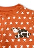 With a warm pumpkin hue and scattered star print, this design brings a cozy, celestial feel to your baby’s wardrobe. Featuring a hand-drawn cow motif, it adds a playful nod to nature. The easy popper fastening makes dressing and nappy changes simple, while built-in feet and fold-over mitts (on smaller sizes) ensure tiny hands and toes stay snug.
