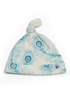 Featuring a delicate teal peacock feather print with signature heart-shaped eyespots on a creamy base, this hat is both whimsical and wearable. The knotted top detail and folded brim ensure a comfy, secure fit while adding extra character.