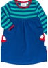 This soft organic cotton dress offers plenty of practical style. With stitched toadstool appliques on the handy little side pockets in deep navy, the contrasting stripy top half with long sleeves and bold red trim. Add a pair of our colourful organic leggings for extra warmth this season - and check out our full matching range here at Toby Tiger.
