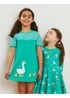Learn moreOur vibrant green organic kids T-shirt dress is the perfect backdrop for our mother duck applique and her herd of adorable chicks. Contrasting horizontal stripes across the top half provides extra style points. Our smaller sizes feature neck popper fastenings for easy peasy changing.