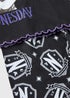 Learn moreUnleash your little one's Wednesday Addams flair in our striking Wednesday kids black top and bottoms pyjama set. Crafted from the softest material, these pyjamas provide maximum comfort for a cosy night's sleep. This pyjama set features a black short sleeved top with a Wednesday placement on the front with purple detailing on the lettuce hem and full length bottoms with Wednesday print all over the bottoms. The elasticated waist ensures the perfect fit for a perfect spooky night sleep.
