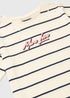 Learn moreIntroduce your little one to a world of style and comfort with our White Stripe Embellished T-Shirt. Crafted from a soft, breathable fabric, this tee ensures your child stays comfortable throughout their playful day. The classic white base is adorned with evenly spaced black stripes, offering a timeless look that pairs effortlessly with any bottom wear. The short sleeves and round neck design provide ease of movement, making it a perfect choice for active kids. A touch of whimsy is added with the “Aloha Love” embellishment in playful pink script, infusing the piece with youthful charm.