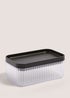 Keep your essentials safe and secure in this handy storage unit. Created with clear ribbed plastic so you can easily see what's inside, it comes complete with a timeless black lid that'll seamlessly slot into just about any home. Dimensions: 6cm x 14cm. Capacity: 500ml.