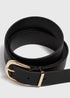 Crafted from high-quality black leather look fabric, this belt features a textured leather strap and a statement gold buckle that adds a touch of glamour. Versatile and stylish, it's the ideal way to cinch in your jeans, dresses, or skirts. Pair with your favourite jeans and a tucked-in blouse for a sophisticated, elevated look or accessorise a simple dress to add a touch of glamour.