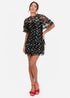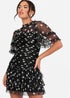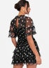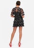 A true celebration of refined femininity, this dress promises to turn heads wherever you go. Set against a black tulle base, an all-over white polka dot pattern exudes a whimsical allure. The gathered bodice and dropped waist sculpt a flattering silhouette, while the ruffled mini skirt adds a touch of flirty volume, moving gracefully with every step. Delicate sheer short sleeves lend an ethereal finish, striking the perfect balance between elegance and contemporary style. Pair this statement piece with red heels and minimal accessories for an effortlessly polished look.
