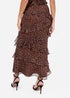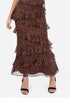 Embrace the wild side of fashion and unleash your inner elegance with this exquisite ensemble. The centerpiece of this set is a flowing A-line maxi skirt, designed with an asymmetrical ruffle detail that zigzags from the cinched waist down to the hem, creating a striking and dynamic silhouette. Paired with the top is a functional wrap top, featuring a delicate ruffle trim that frames the V neckline, creating alluring cold-shoulder sleeves. Adjustable slender straps ensure a comfortable fit, making it as practical as it is stylish. Style this animal print co-ord set with black strappy heels and gold accessories to captivate onlookers