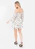 The statement Polka-Dot dress features a horizontally gathered bodice with a shirred back ensuring a flattering and comfortable fit, while the frilled bardot neckline and adjustable thin straps enhance the off-shoulder silhouette. The gathered waist flows into a tiered mini skirt, creating a ruffled effect for extra volume and movement. Perfect for a summer party or an evening out, style this long-sleeved mini dress with black footwear and dainty jewellery for a sophisticated yet playful look.
