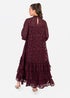 Perfect for special occasions and unforgettable moments, this enchanting maroon dress captivates with its rich texture and sophisticated details. Crafted from luxurious floral burnout fabric, the gown features a high neckline with a delicate button-and-loop fastening and a small keyhole detail, adding a refined touch to the silhouette. Long sleeves complement the design, while the midaxi skirt boasts layers of tightly gathered ruffles at the hem, creating dramatic movement and depth. Beneath the semi-sheer burnout overlay lies a matching slip with adjustable straps, ensuring a flawless fit. Style this versatile piece with strappy heels and minimal accessories for an effortlessly elegant look that commands attention.