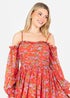 At Anaya with Love each item is consciously designed and made with 100% recycled fabric allowing you to embrace both style and sustainability. The statement bardot neckline features delicate frill detailing, enhancing the off-shoulder silhouette with a touch of charm. The long-sleeved bodice is designed with a horizontally gathered front for a tailored look, while the shirred back ensures a flattering and comfortable fit. Thin adjustable straps provide added security and versatility, complementing the neckline beautifully. The gathered waist flows into a tiered mini skirt, creating a ruffled effect for extra volume and movement. Perfect for a summer parties and holiday dinners, style this floral mini dress with gold heels and dainty jewellery for a sophisticated yet playful look.