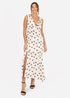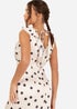 Make every occasion unforgettable with this stunning polka dot dress. Crafted from luxurious satin fabric, the dress features an all-over black polka dot print on a soft cream background. The deep V-neckline with delicate ruffle detailing adds a touch of romance, while the thigh-high side split lends just the right amount of allure. The asymmetric silhouette and sleeveless design ensure comfort and effortless style, making it perfect for dancing the night away. Whether you're a guest at a wedding or celebrating a romantic evening, this dress is best paired it with strappy heels and subtle accessories for a show-stopping look.