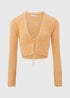 The Apricot Tie Front Cardigan is a knitted, cropped cardigan featuring a tie front design. Its warm apricot colour gives it a soft and inviting appearance. The cardigan has a V-neckline and long sleeves, making it cosy and comfortable. The intricate knit pattern throughout the fabric adds texture and visual interest. Whether fastened at the front with the tie or left open, this cardigan is a stylish addition to any outfit.