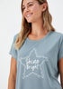 Cute and cosy, this pyjama set comes complete with ribbon detailing to make special occasion gifting a doddle. In a durable and sumptuously soft blend of fabric, the aqua set comes with a short-sleeved top which charmingly reads, 'Shine Bright', alongside a stretchy, cuffed pair of bottoms that are detailed with a fun mix of star prints. Length: 73cm.
