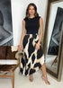 Our Multi Marble Print 2 In 1 Asymmetric Hem Pleated Midi Dress is right on trend this season! Featuring a black jersey sleeveless top, padded shoulders, a midi asymmetric hem pleated skirt with lining and a zip up back. Style with heels and a matching bag to complete the look!