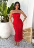 Get ready to impress in our Red Embroidered Overlay Bandeau Cut Out Midi Dress. Featuring a curve enhancing bodycon silhouette, an embroidered fabric overlay, a bandeau top with rubber facing, a side waist cut out, scalloped lace detailing on the edges, a side zip closure and a midi length skirt with a small back split. Complete the look with some strappy heels and a matching clutch for your next summer occasion.