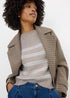 The subtle beige base with contrasting stripes gives it a classic yet contemporary look, making it easy to pair with jeans, trousers, or skirts for a versatile, go-anywhere outfit.