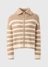 Stay snug and stylish with this trendy zip-through stripe cardigan in neutral beige. An effortlessly chic layering piece for any occasion, this cardigan is crafted from a soft knitted material to ensure exceptional comfort and warmth. The wide collar neck with the beige and white stripe pattern creates a stylish piece perfect for everyday wear. Dress it up by layering over a dress and heels or dress it down with jeans and trainers for a casual everyday look.